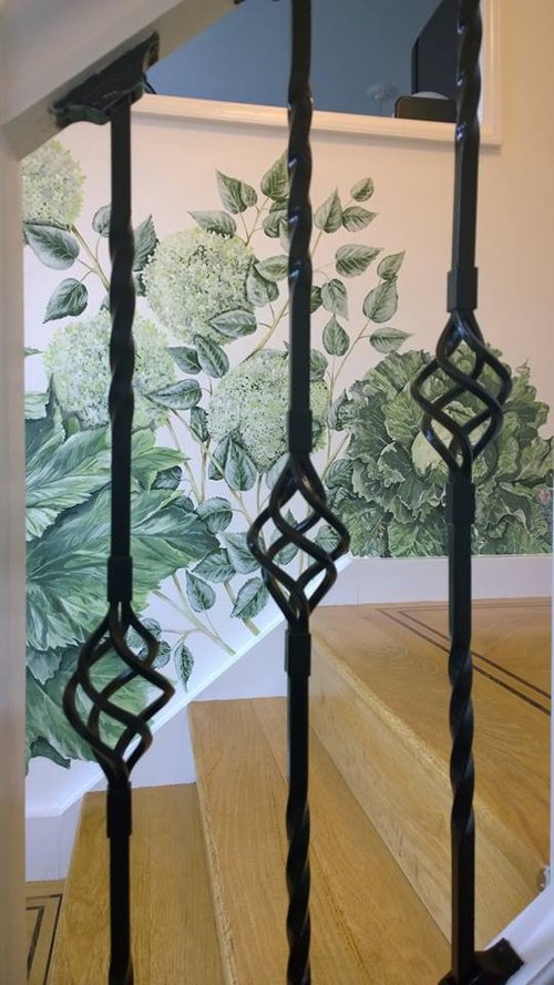 The client wanted something light and fresh in her entrance hall that reflected the garden around them. It took me five days to paint and was an especially enjoyable commission as I was kept company by their many dogs and cats, and the house and garden were particularly beautiful.