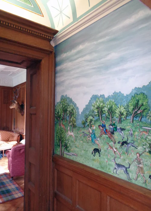 This mural is in the entrance hall of a castle in Scotland. The client wanted something relevant to the period of the castle. I studied tapestries and wall paintings for how grass, trees and landscapes were painted and also designs for barrel ceilings. A modern twist was added when the pack of hounds became labradors and greyhounds. A portrait of the families pet cat and dog appear and the children chose the colours of the riders clothes.