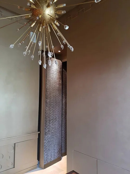 I was chosen to paint this mural by an interior designer and her client who wished to recreate a mural in the main bathroom of her clients house based on the anniversary packaging of a famous champagne house. I created a light infused background of pale blues, greens and off whites, with weeds, underwater plants and bubbles. The fish were added last using gold, silver, bronze, copper and platinum leaf. Over 300 people applied for this commission and I was thrilled to be chosen to paint in such a glorious house.