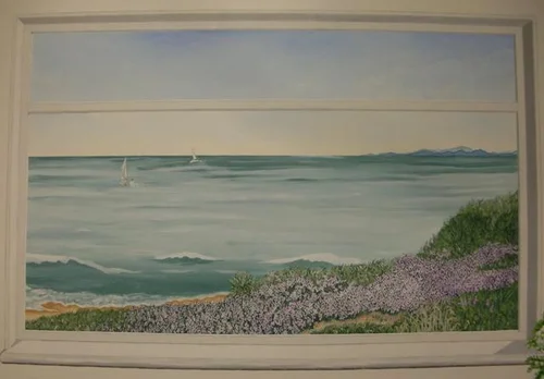 This was my first of several murals painted in a retirement village in California. The idea was to give the residents something to look at whilst they waited for their washing in an otherwise featureless room. I had spent a bit of time exploring the landscape around San Francisco. I had fallen in love with the beaches and took many photographs of the local plants which all went into the work.