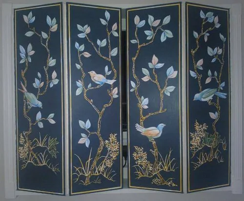 The client asked me to create a chinoiserie effect on three walls of their library. I visited the V&A to look at their fabrics and Chinese section as I wanted to study how they painted their birds. I mixed five different shades of blue and green for the back ground and then painted the birds and plants on top.