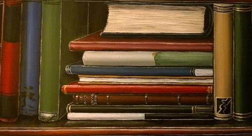 These books were painted onto a canvas in order to cover a radiator in a flat in Bristol. The idea is that each book represented an important influence in the clients life. He, or they, chose a title that suited either an experience they had together or a title that summed up their personality. The ruined books are the client’s ex’s and there are also a few gilded books that are in tribute to some of his friends who are sadly deceased.