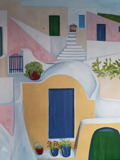 The client contacted me to painted a mural in her pool house, with both the ceiling and three walls to be painted. The pool was emptied and covered with boards and a scaffolding tower erected. A prolific traveller, there was some discussion as which country would be the best subject matter, but eventually a decision was made to base the mural on Santorini. At one end of the room I painted a pink house with trompe L’oeil shutters, lattice work and plant pots so that standing by the pool it felt as if you were looking down the village and out to see. The colour of the sea was then painted to match the tiles of the pool, with cliffs and Greek fishing boats and her yacht in the distance.