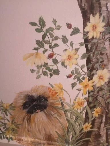 This mural was in a very dark basement in California. I decided on lots of native birds, animals and insects on all four walls, with a few trees, long grass and flowers. The only stipulation the client made was that the bear should not look scary.