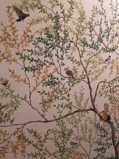 I was asked to paint this mural by a designer who was working on Studio Ashby’s restoration project in J.M. Barrie’s house. As a huge admirer of the author I was very excited to be part of the project. The brief was to feature trees from Hyde Park - I chose Ash, Birch, Willow, Oak and Maple - to be painted on the panels in the study of the house. These were to be created in the style of a screen print - which means using block colours sometimes and uniform shapes that do not always meet up. The colours chosen by the designer to match the rest of the room.