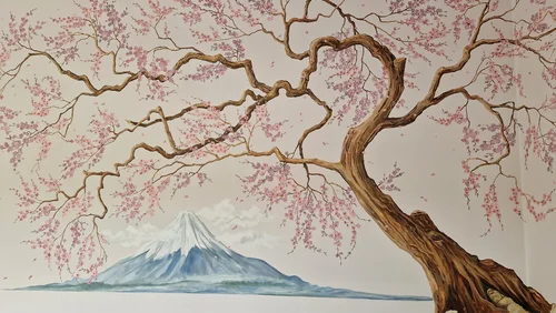 Painted in Acton, London, on the wall of the main room, inspired by twisted cherry blossom trees and rocks, with Mount Fuji in the back ground. The base of the mountain will be just above the sofa, the colour of which is the same as the center of the flowers, and the rocks match the colour of the floor.